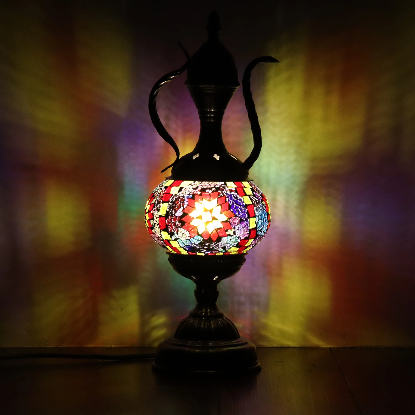 Po zapaleniu lampa emituje ciepłe, nastrojowe światło, które przenika przez kolorowe szkło, tworząc na ścianach i suficie fascynujące, egzotyczne wzory.
