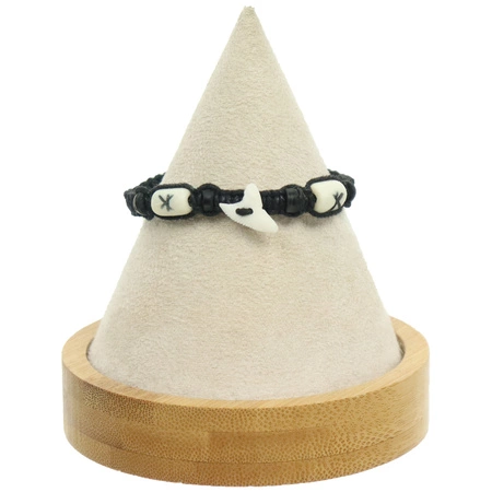 Bransoletka z kłem rekina to wyjątkowy dodatek, w którym centralnym elementem jest prawdziwy kieł rekina. Towarzyszą mu koraliki z kości bawolej, które podkreślają naturalny i niepowtarzalny charakter biżuterii.