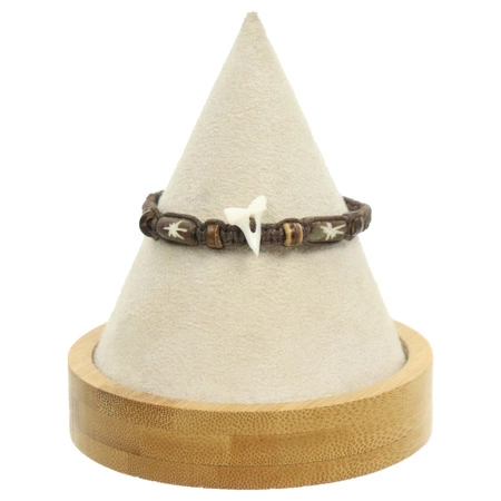 Bransoletka z kłem rekina to wyjątkowy dodatek, w którym centralnym elementem jest prawdziwy kieł rekina. Towarzyszą mu koraliki z kości bawolej, które podkreślają naturalny i niepowtarzalny charakter biżuterii.