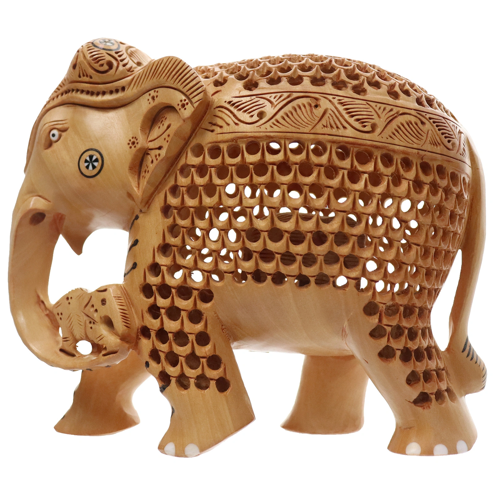 Ta drewniana figurka słonia została wyrzeźbiona w Indiach z jednego kawałka drewna, co nadaje jej spójność i wyjątkowy charakter. Słoń ma trąbę skierowaną w dół, co w wielu tradycjach symbolizuje uziemienie i stabilność. Korpus zdobi misterny wzór dżali, czyli ażurowa, dekoracyjna technika rzeźbiarska polegająca na tworzeniu precyzyjnych, geometrycznych lub roślinnych prześwitów w drewnie. Wewnątrz większego słonia znajduje się mniejszy, również wyrzeźbiony ręcznie, co świadczy o dużej precyzji wykonania. Taka drewniana figurka słonia łączy kunszt rzemiosła z tradycyjną indyjską symboliką i tworzy wyrazisty, naturalny element dekoracyjny. Dzięki neutralnemu materiałowi i delikatnym detalom świetnie prezentuje się zarówno w klasycznych, jak i bardziej etnicznych aranżacjach.