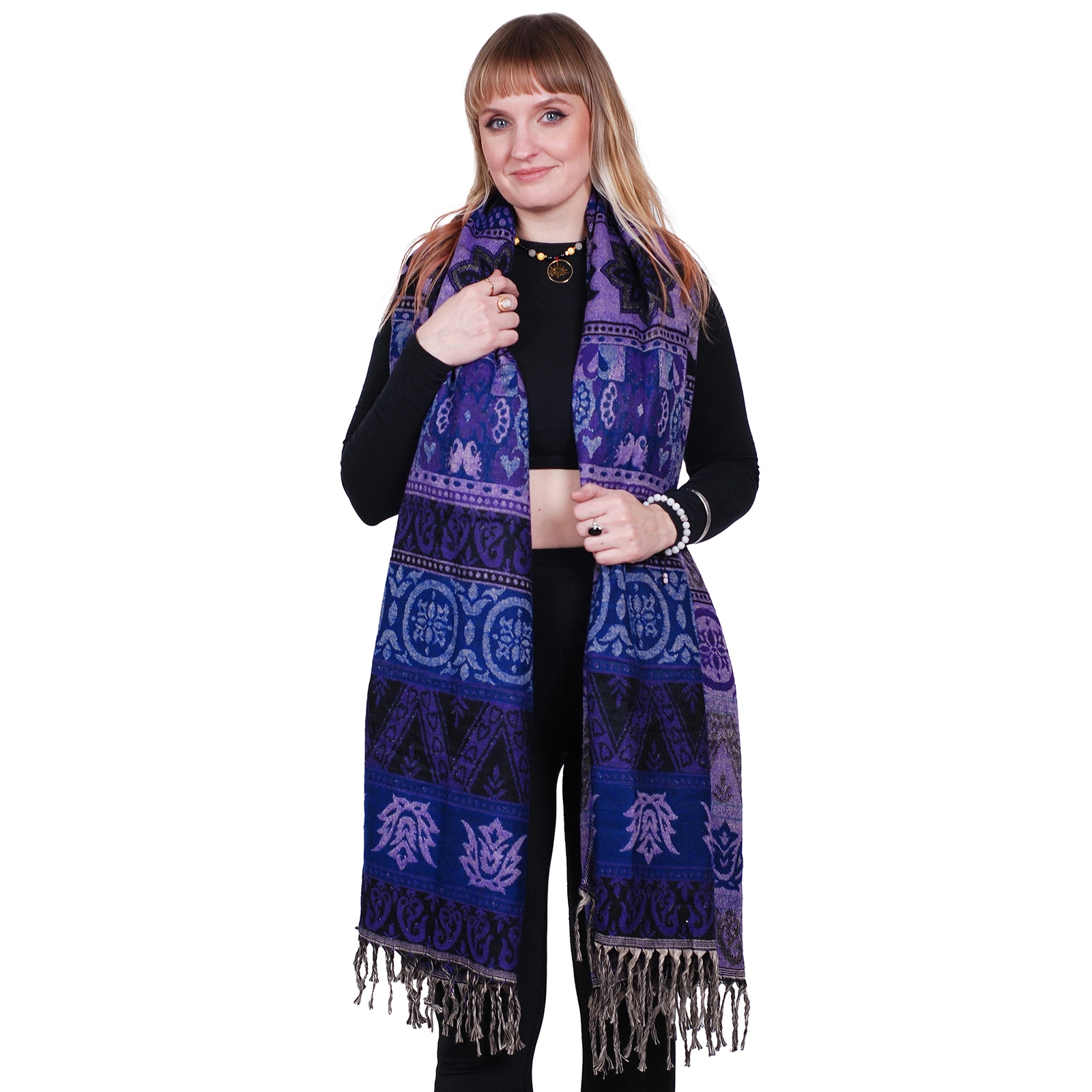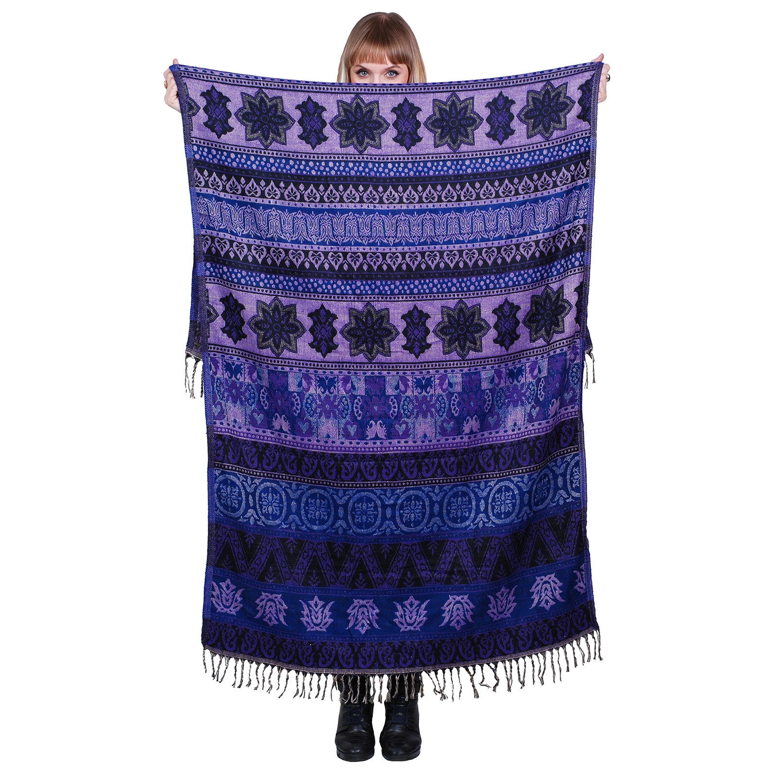 Dzięki swojej formie szal doskonale sprawdzi się w chłodniejsze poranki, podczas spacerów oraz jako lekka osłona przed słońcem. To wszechstronny element garderoby dla osób, które cenią swobodę oraz etniczne wzornictwo.