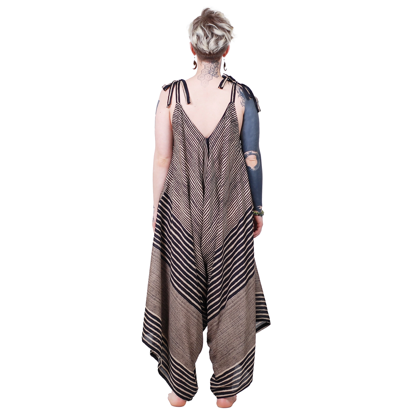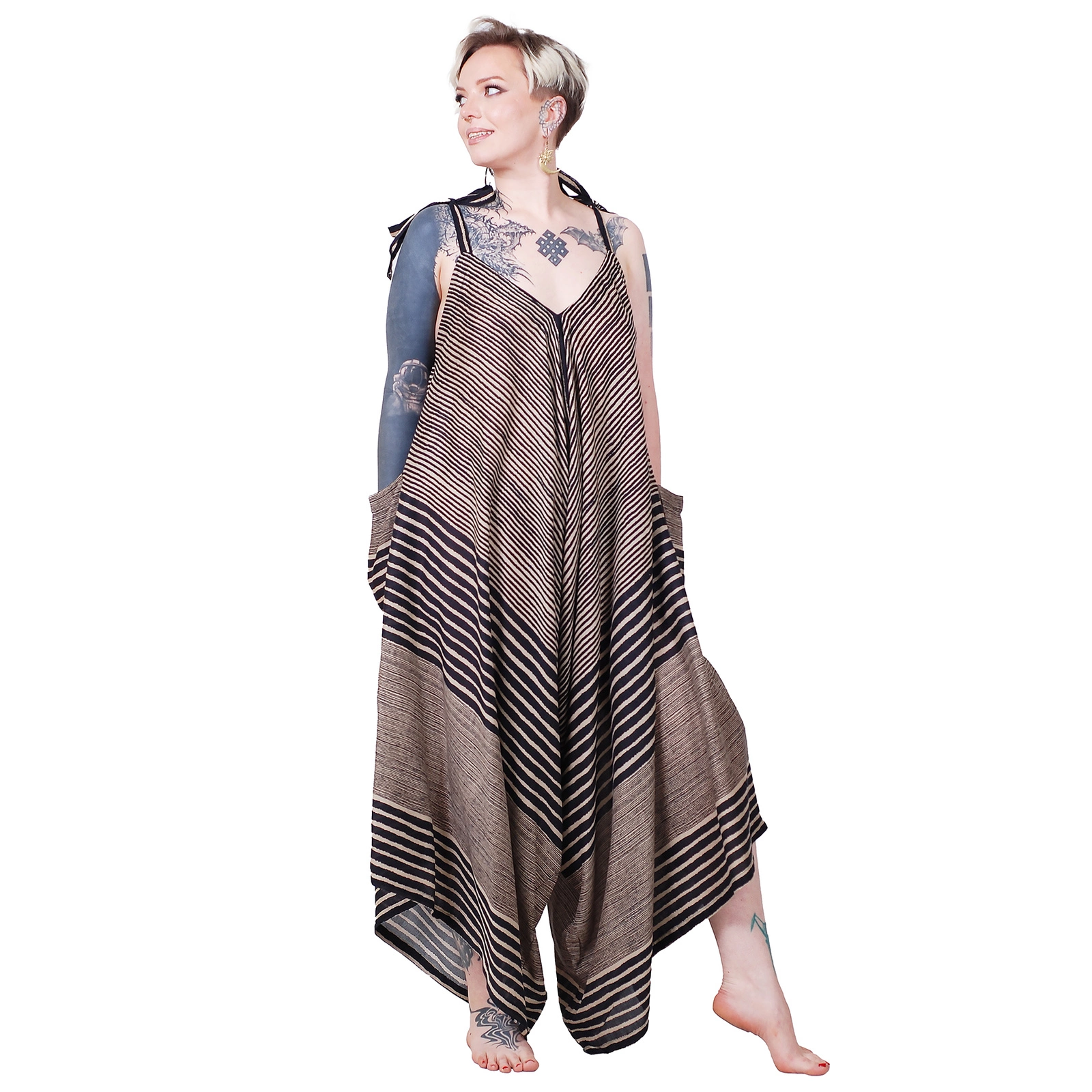 Kombinezon w pasy to lekka, komfortowa propozycja na co dzień i na wyjazdy – idealna na letnie dni lub jako swobodny strój domowy. Uszyty z przewiewnej, naturalnej bawełny, zapewnia wygodę i dopasowanie do sylwetki dzięki luźnemu krojowi i elastycznym ramiączkom. Prosty fason w pionowe pasy optycznie wydłuża sylwetkę, a całość nawiązuje do stylu boho z nutą orientu.