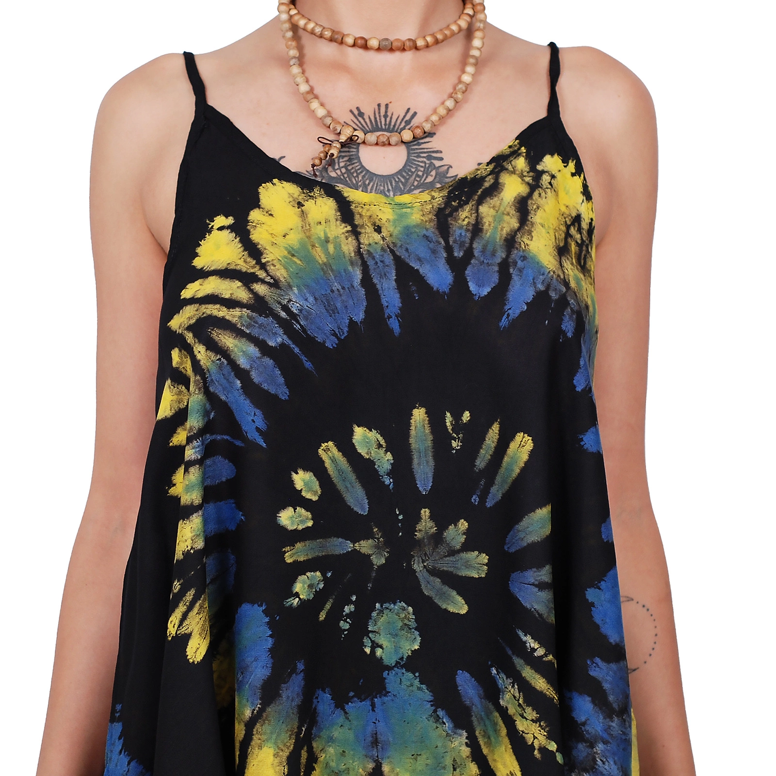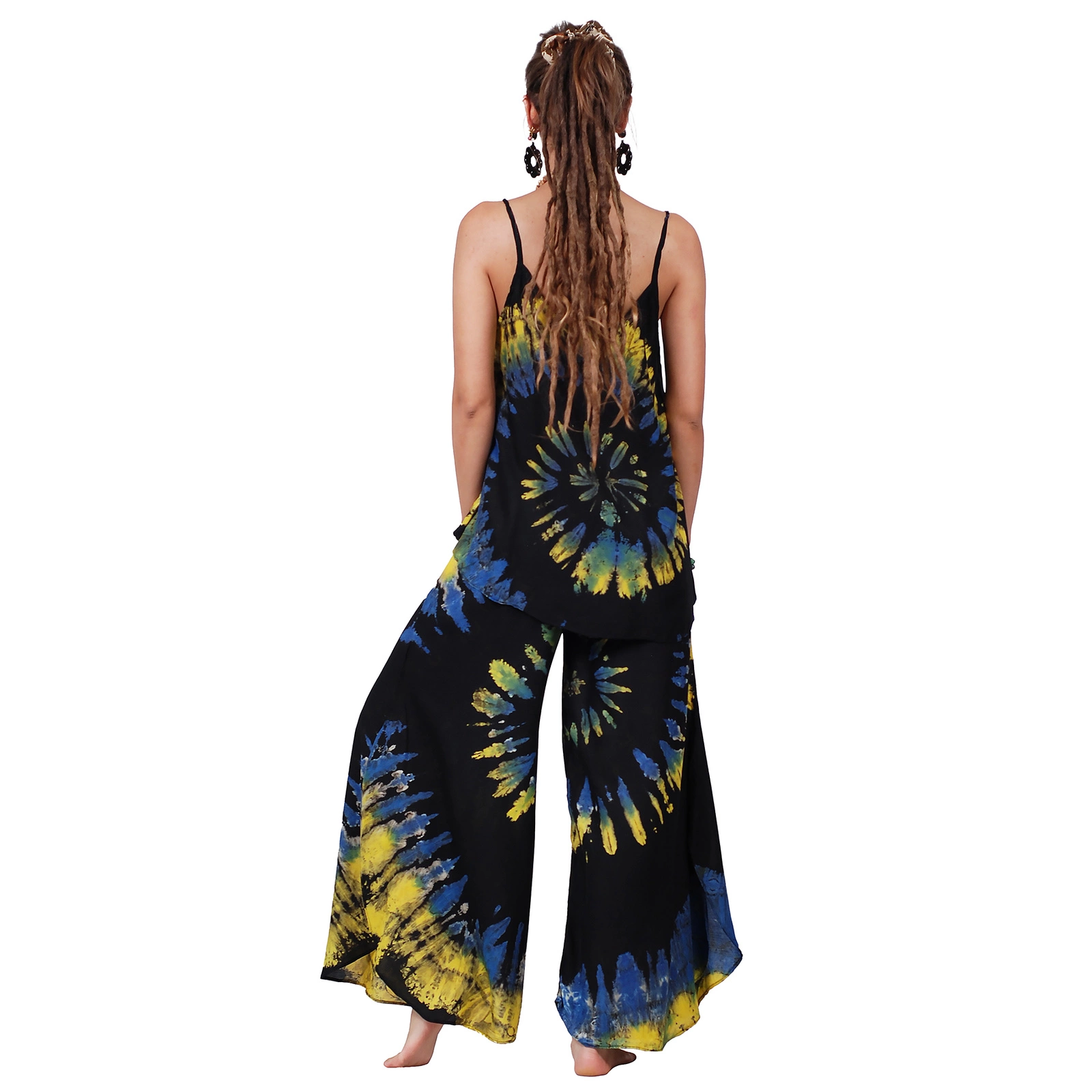 Komplet batik to lekki i wygodny zestaw składający się z koszulki na cienkich ramiączkach oraz długich, luźnych spodni z rozszerzanymi nogawkami. To idealna propozycja na lato, odpoczynek w domu, spacer po plaży lub swobodną stylizację w duchu boho. Ręcznie barwiona tkanina sprawia, że każdy zestaw jest niepowtarzalny i przyciąga uwagę subtelnym, artystycznym wzorem.