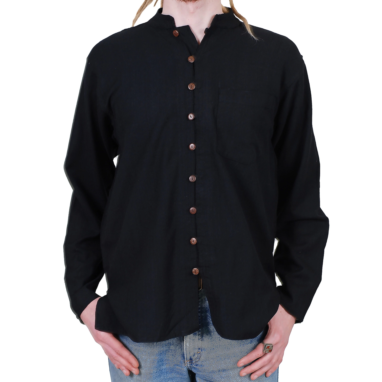 Ponadczasowy, luźny krój z praktycznymi kieszeniami i rozcięciami nie krępuje ruchów, a drewniane guziki i niska stójka nadają koszuli unikalny, etniczny charakter.