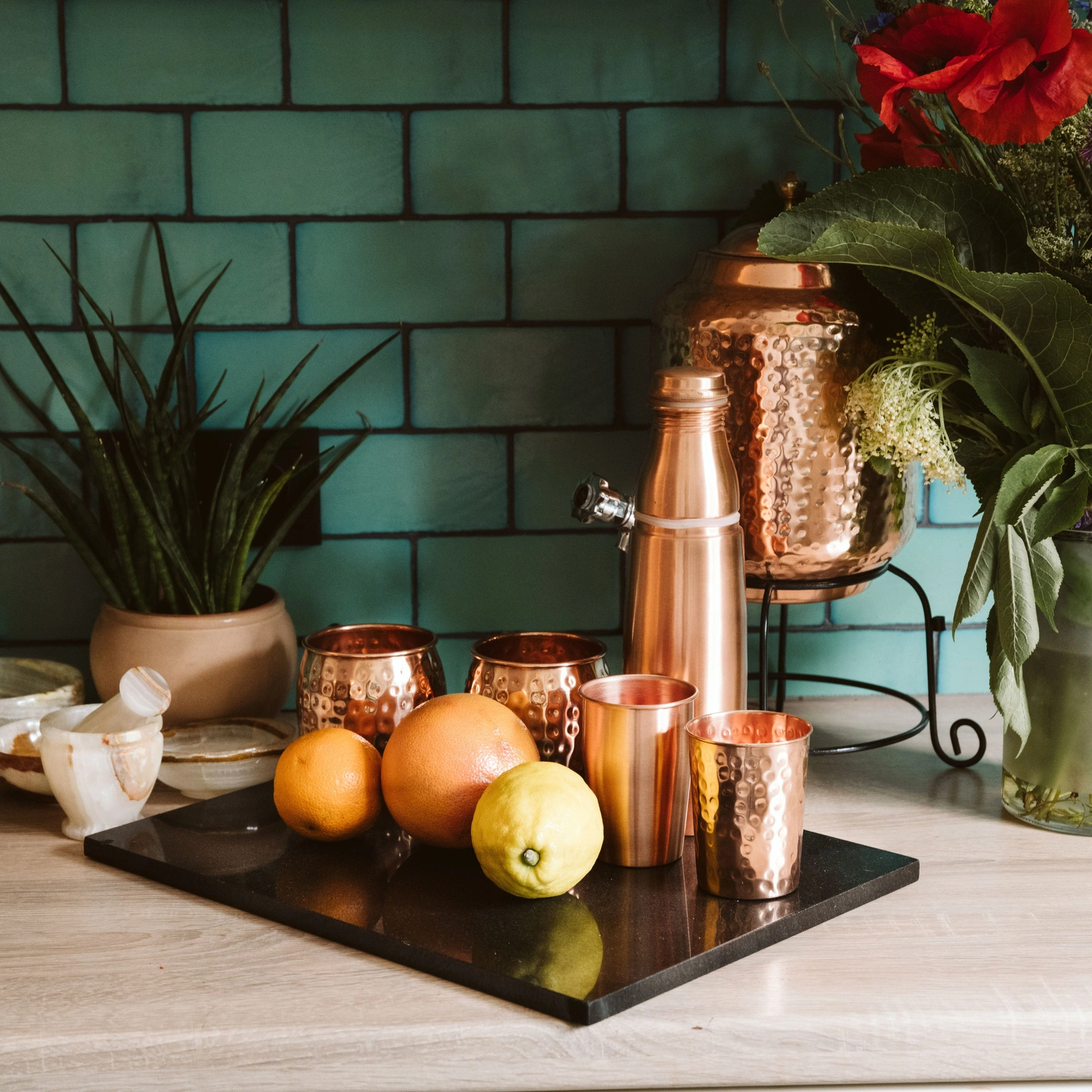 Każdy element miedzianego zestawu jest wykonywany ręcznie, dlatego poszczególne egzemplarze mogą się nieznacznie różnić fakturą czy odcieniem, co świadczy o autentycznym procesie rzemieślniczym.