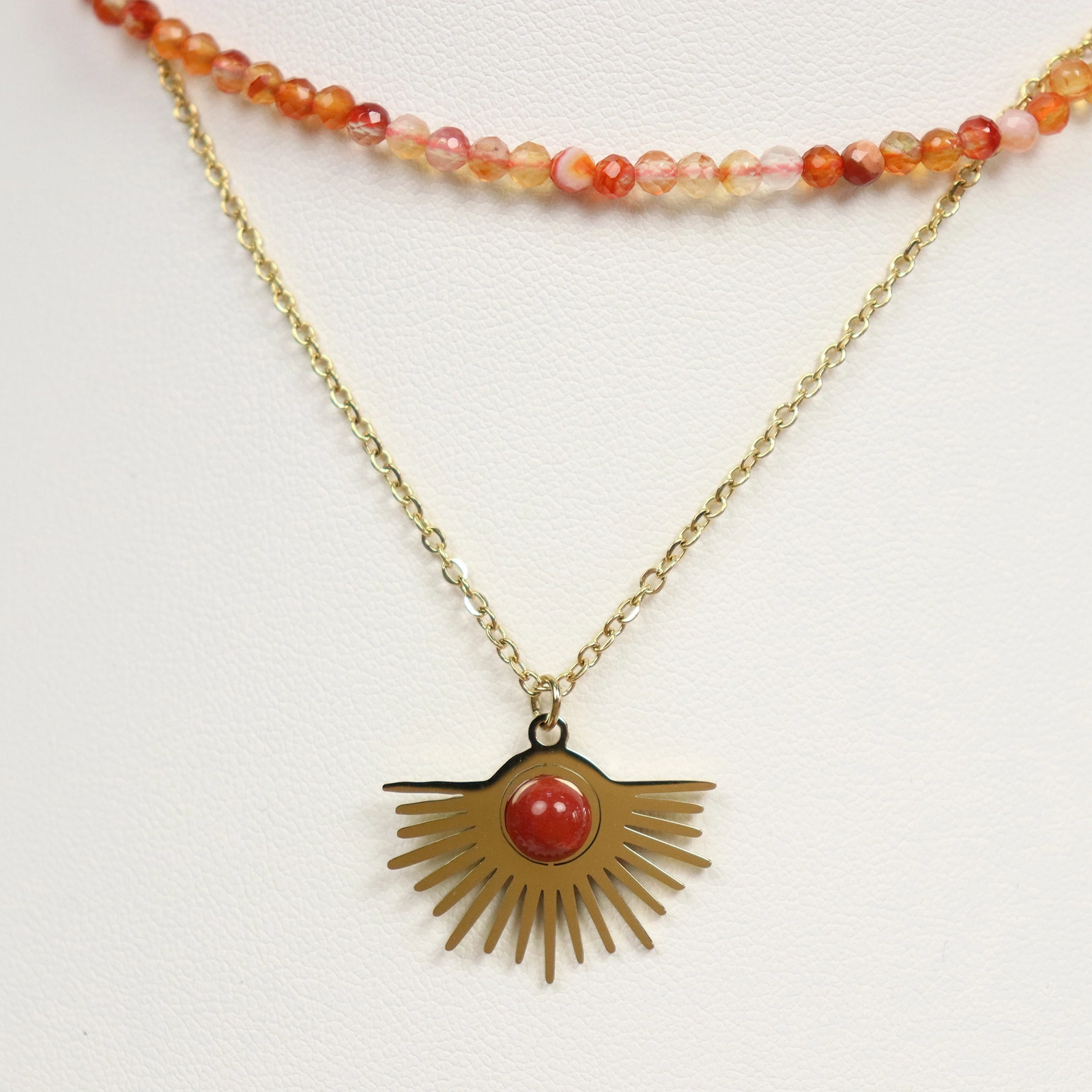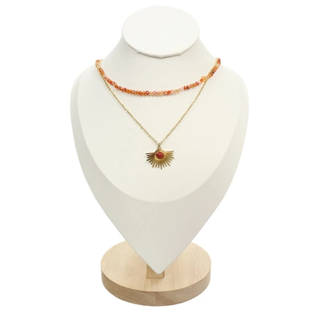 Naszyjnik z kamieniami to zestawienie kontrastujących materiałów – kamieni półszlachetnych i stali dodaje naszyjnikowi charakteru i wyróżnia go na tle pozostałych. Naszyjnik – dzięki praktycznemu zapięciu – można perfekcyjnie dopasować do szyi. Może być noszony luźno, na obojczykach lub w formie kamiennego chokera. Godna uwagi jest również piękna, przyciągająca wzrok zawieszka w kształcie półsłońca.
