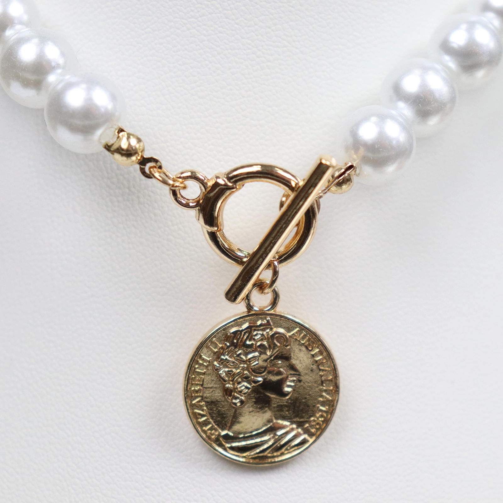 Naszyjnik z pereł z zawieszką w formie złotej monety to elegancka biżuteria w stylu vintage, łącząca klasyczne piękno z nowoczesnym akcentem.