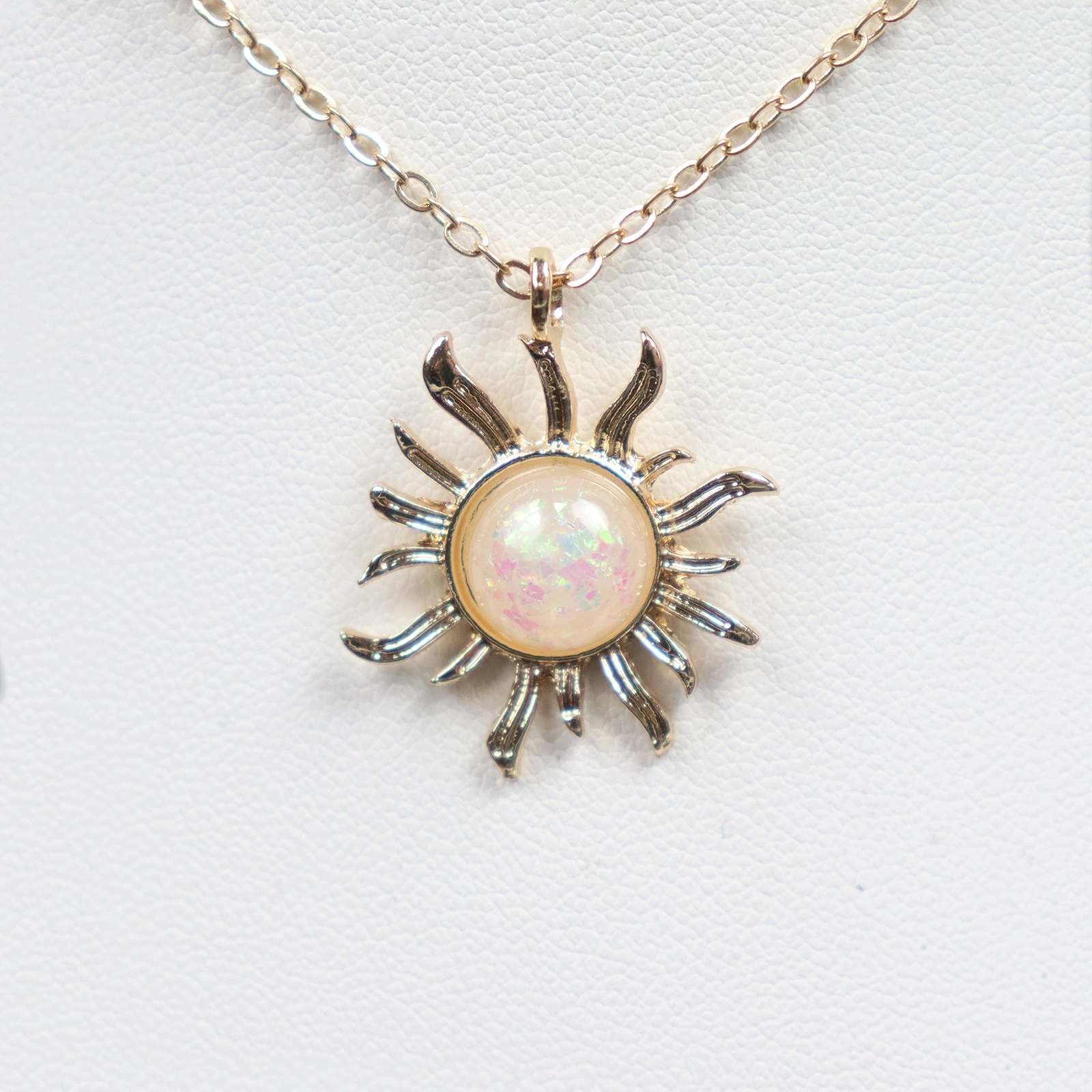 Zawieszka w formie promiennego słońca przyciąga wzrok detalami i subtelnym połyskiem, a umieszczony w jej środku kamień dodaje całości elegancji i wyjątkowego charakteru. Naszyjnik wykonany jest z metalu w kolorze złota lub srebra, dzięki czemu można dopasować go do indywidualnego stylu. To uniwersalny dodatek, który łączy symbolikę światła i pozytywnej energii z nowoczesnym, modnym wyglądem. Idealny jako osobisty talizman lub prezent z przesłaniem.