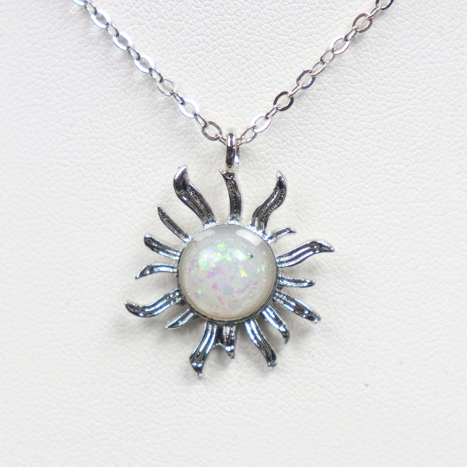 Zawieszka w formie promiennego słońca przyciąga wzrok detalami i subtelnym połyskiem, a umieszczony w jej środku kamień dodaje całości elegancji i wyjątkowego charakteru. Naszyjnik wykonany jest z metalu w kolorze złota lub srebra, dzięki czemu można dopasować go do indywidualnego stylu. To uniwersalny dodatek, który łączy symbolikę światła i pozytywnej energii z nowoczesnym, modnym wyglądem. Idealny jako osobisty talizman lub prezent z przesłaniem.