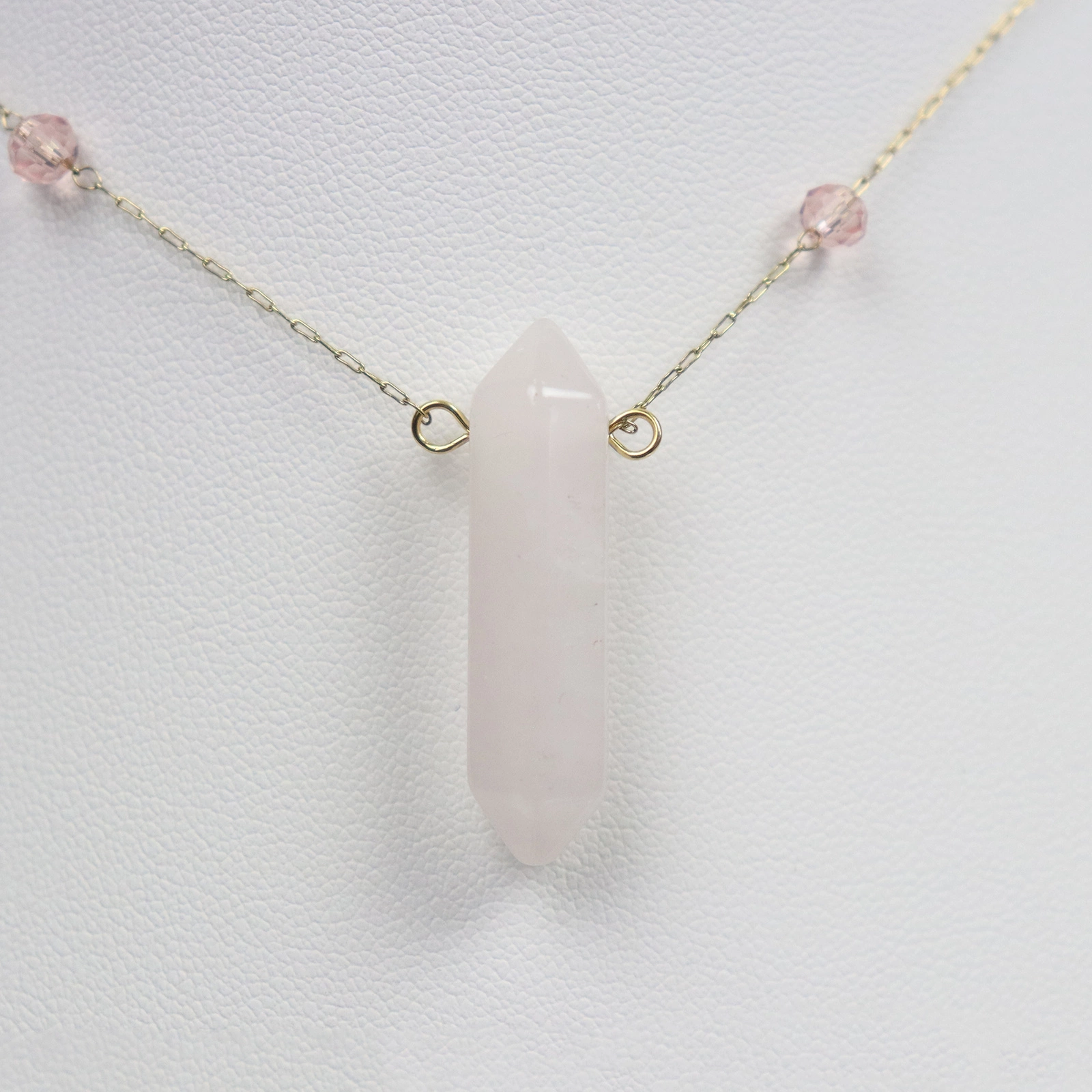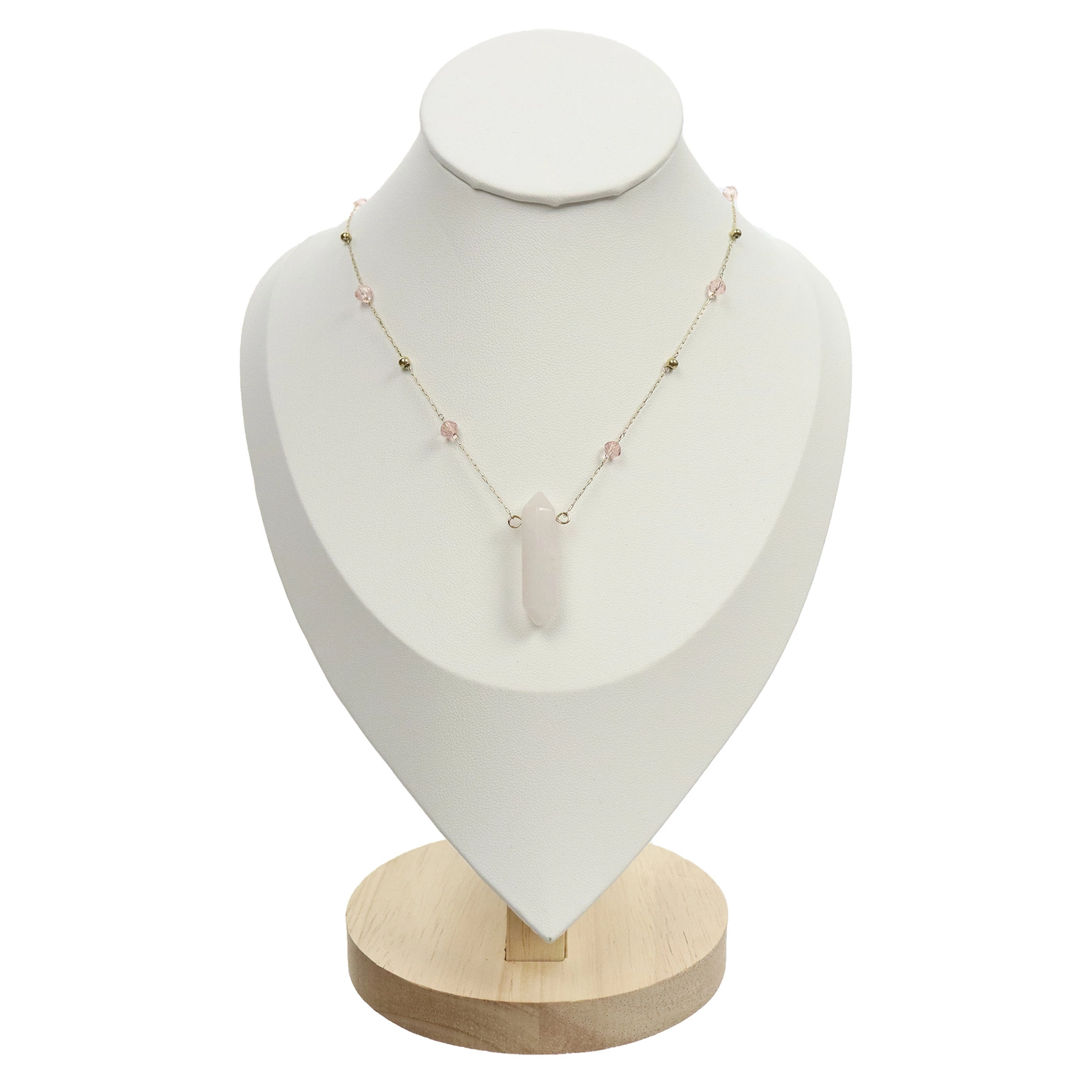 Elegancki naszyjnik wykonany z cienkiego łańcuszka ze stali nierdzewnej, ozdobiony półszlachetnym kamieniem w kształcie podłużnego kryształu. Dodatkowo zdobiony drobnymi koralikami w odcieniach kamienia, które nadają mu subtelny i kobiecy charakter. Idealny jako delikatny dodatek do codziennych stylizacji lub wyjątkowy akcent na specjalne okazje.