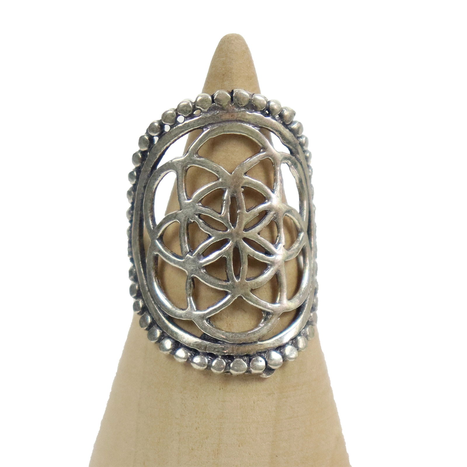 Pierścionek indyjski z motywem Kwiatu Życia to biżuteria inspirowana geometrią i współczesną symboliką duchową. Motyw Kwiatu Życia, uważany za wzór odzwierciedlający porządek i harmonię wszechświata, został przedstawiony w formie precyzyjnie zdobionego detalu. Geometryczny układ linii przyciąga uwagę i może być interpretowany jako znak równowagi, rozwoju i wewnętrznego spokoju.