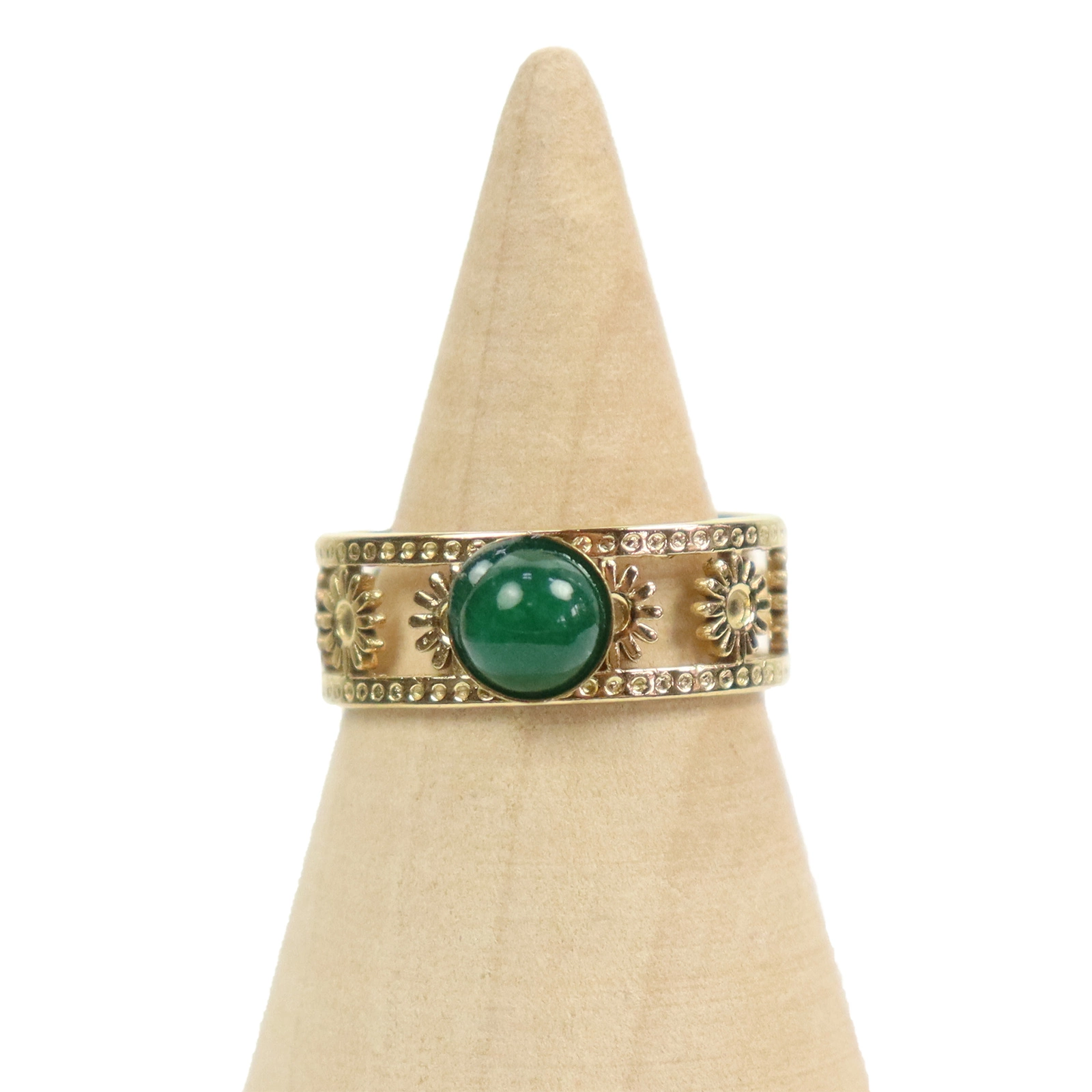 Zielony kamień przyciąga uwagę swoją głębią barwy, tworząc piękny kontrast z promienistym wzorem słońca, dzięki czemu pierścionek staje się nie tylko eleganckim dodatkiem, ale też talizmanem pozytywnej energii.