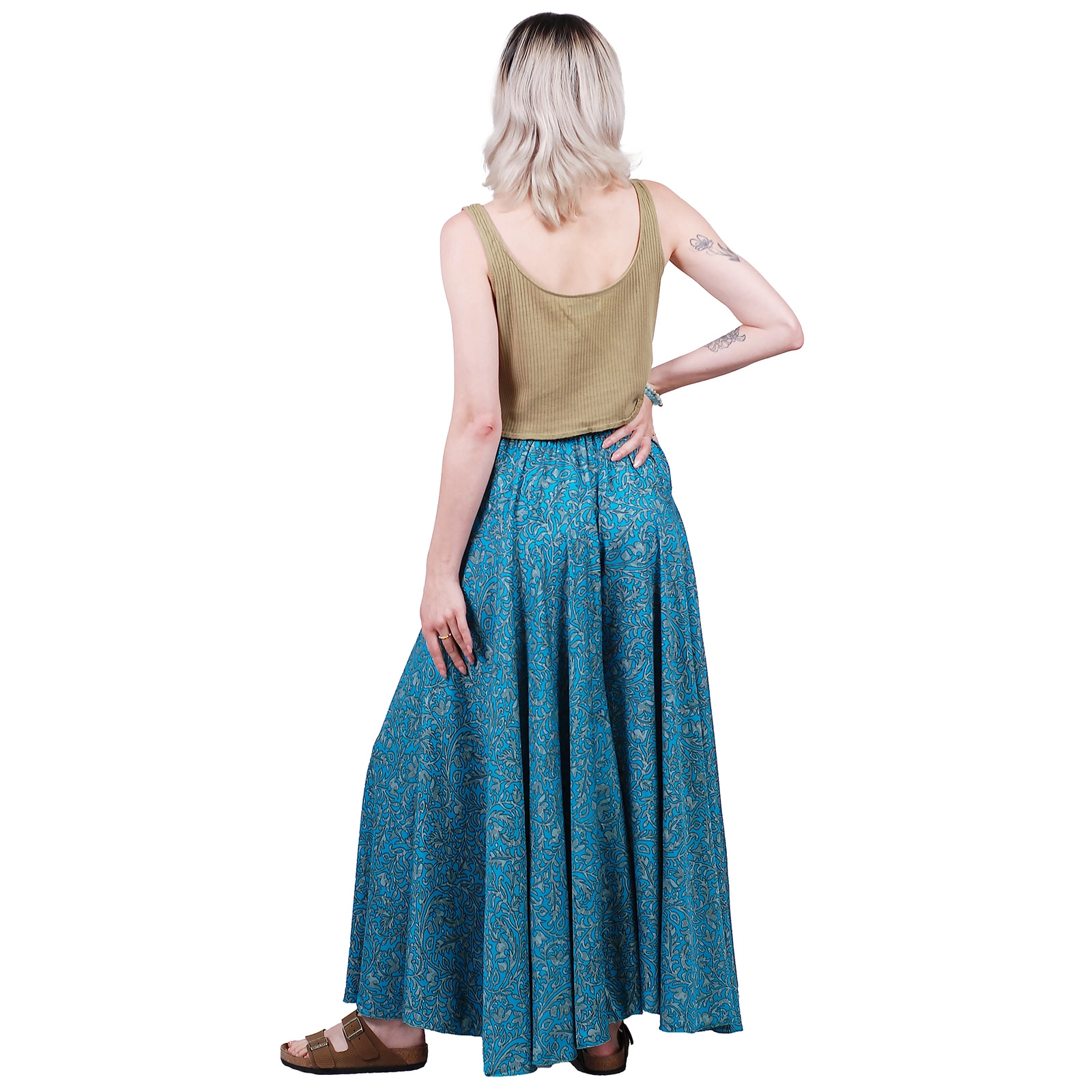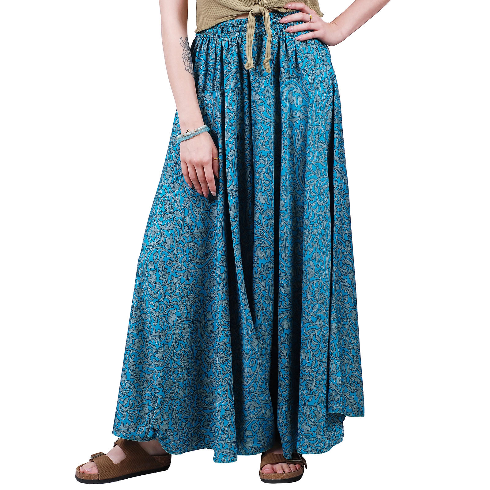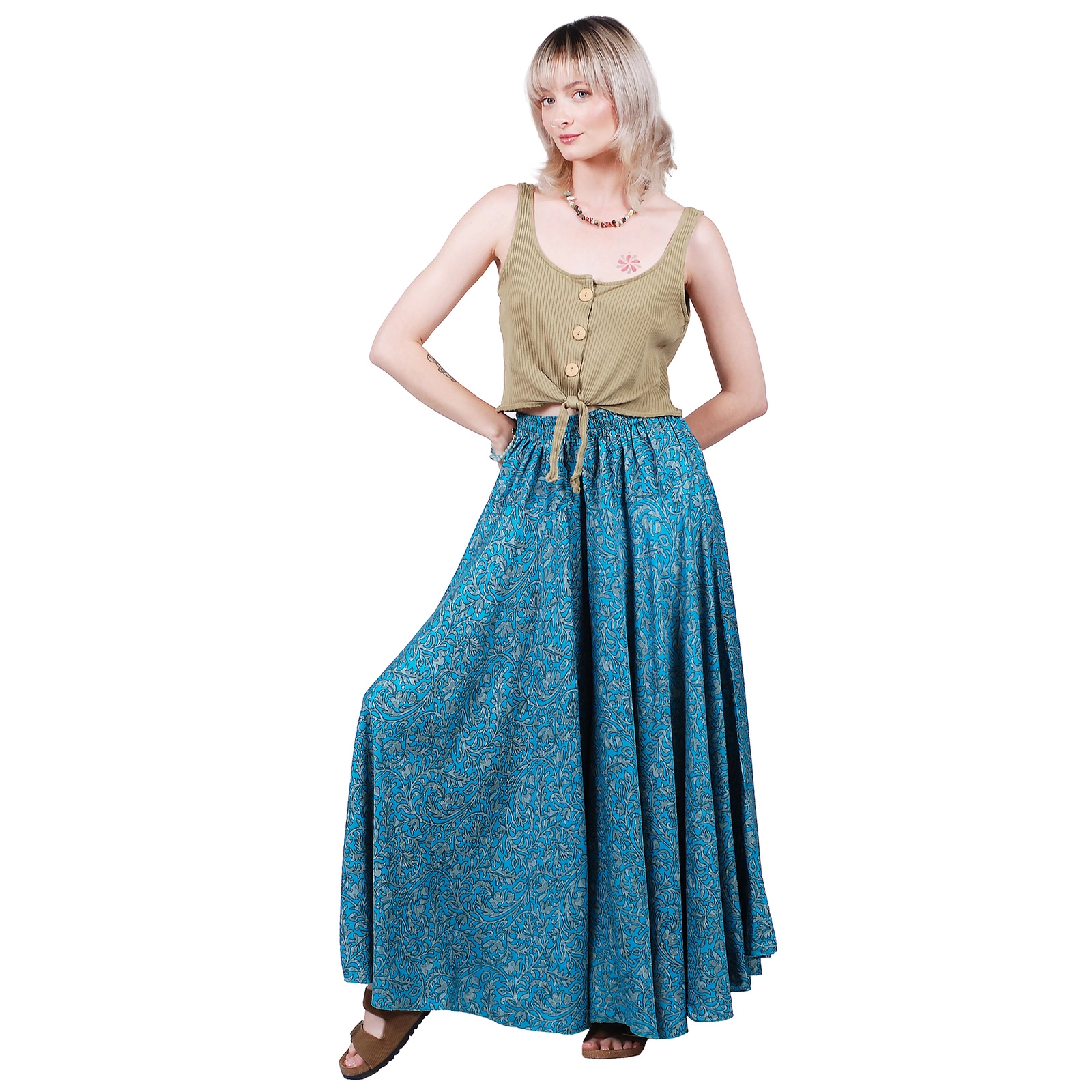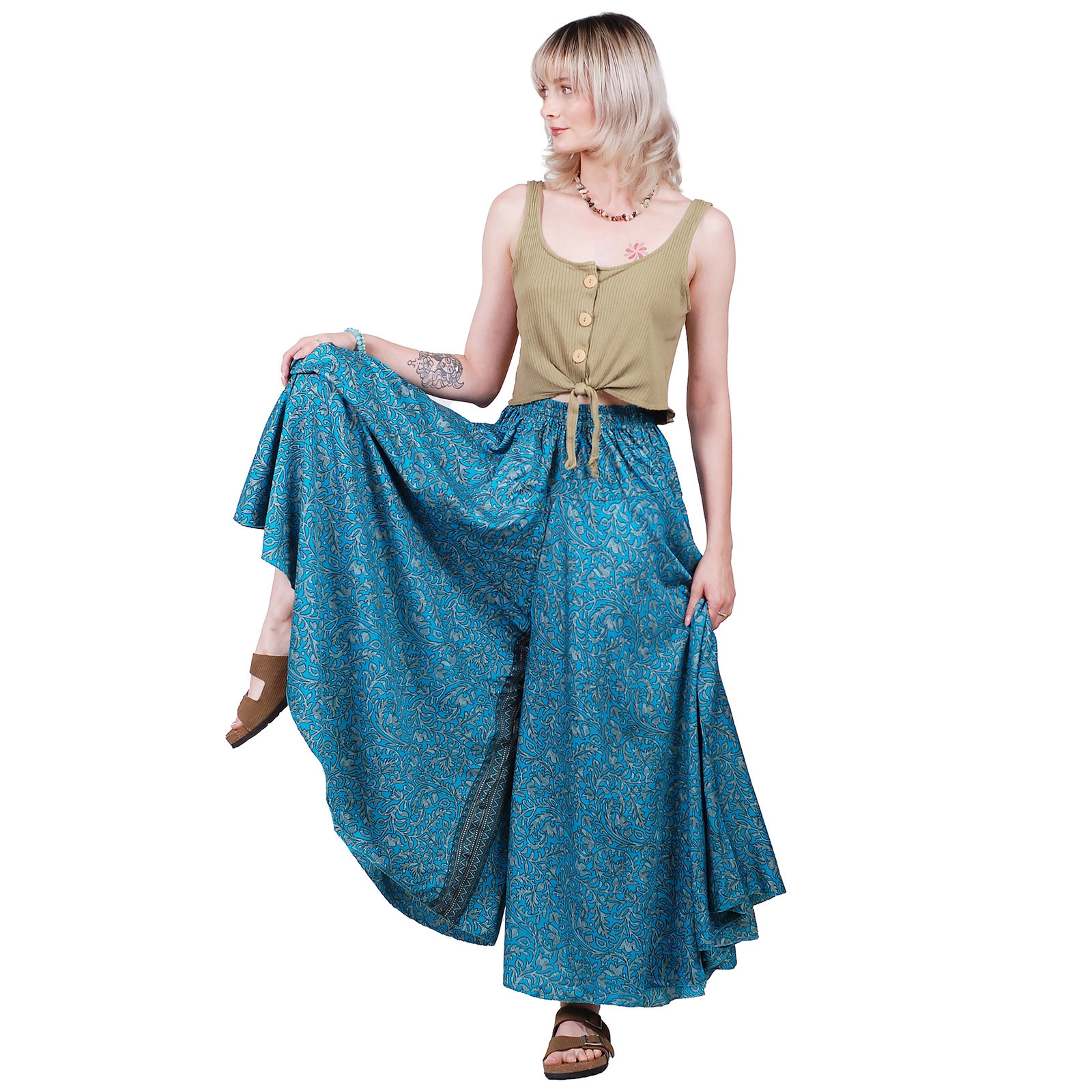 Uszyte z lekkiego materiału spodnie motyle łączą wygodę codziennego noszenia z oryginalnym, etnicznym wzornictwem.