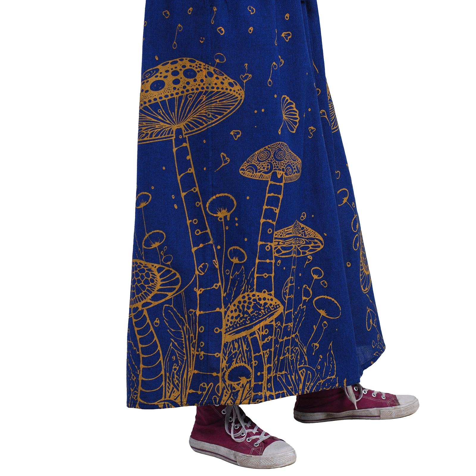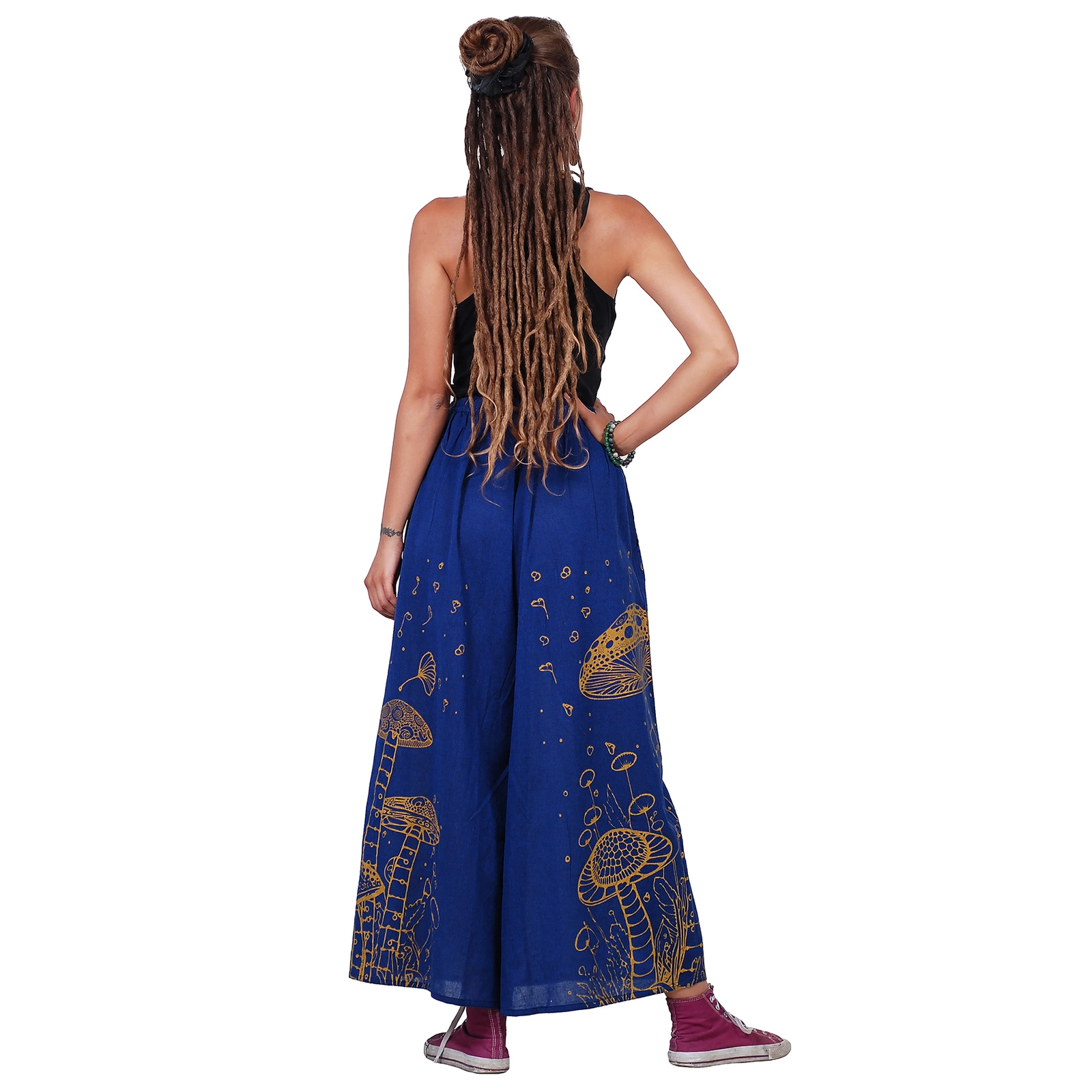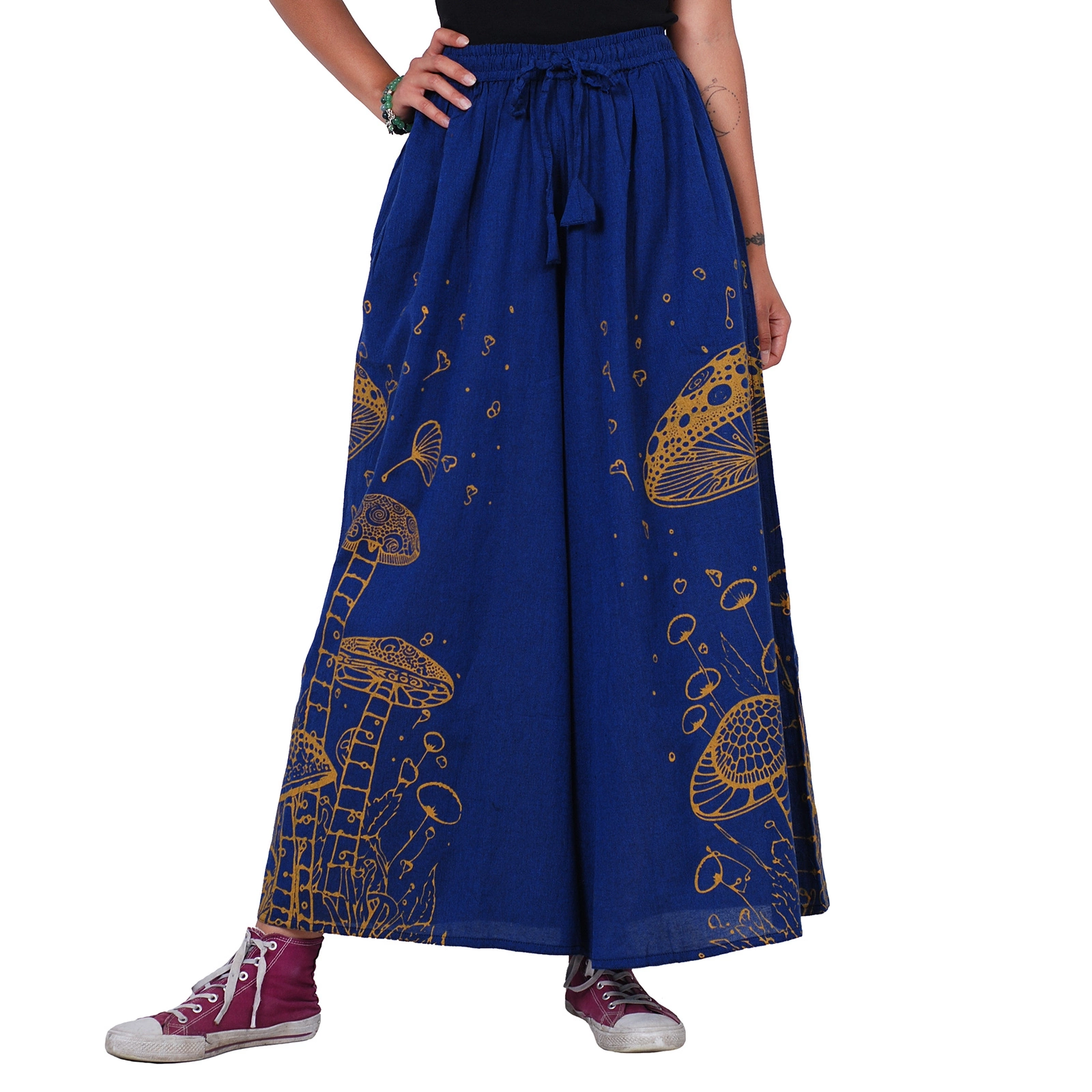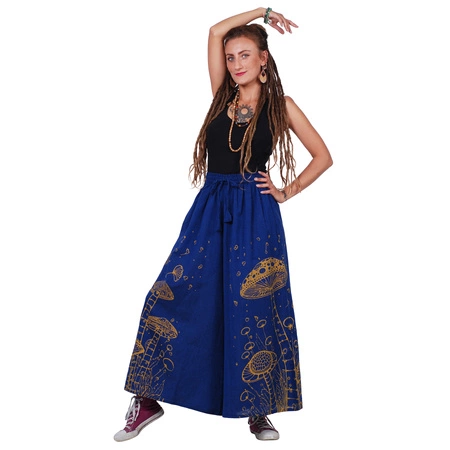 Wzór z motywem grzybów nadaje im unikalnego charakteru i artystycznego wyrazu. Spodnie palazzo w grzyby łączą styl boho z wygodą, tworząc idealny wybór dla osób ceniących oryginalne i swobodne stylizacje.