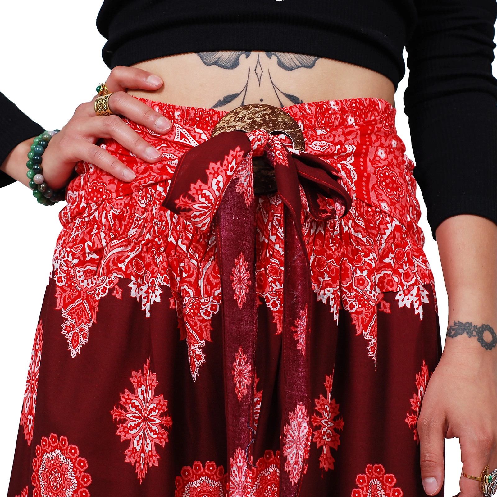 Spodnie wzorzyste wiązane to komfortowa propozycja dla miłośników wygody, naturalnych materiałów i niebanalnych wzorów. Szerokie nogawki i przewiewna bawełna zapewniają swobodę ruchu i doskonałe dopasowanie zarówno na co dzień, jak i podczas podróży, relaksu czy praktyki jogi. Elastyczna gumka w pasie gwarantuje wygodę, a dodatkowe wiązanie z dekoracyjnym, drewnianym elementem dodaje całości stylowego charakteru.