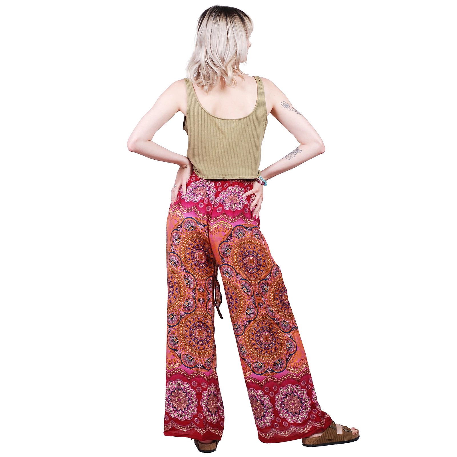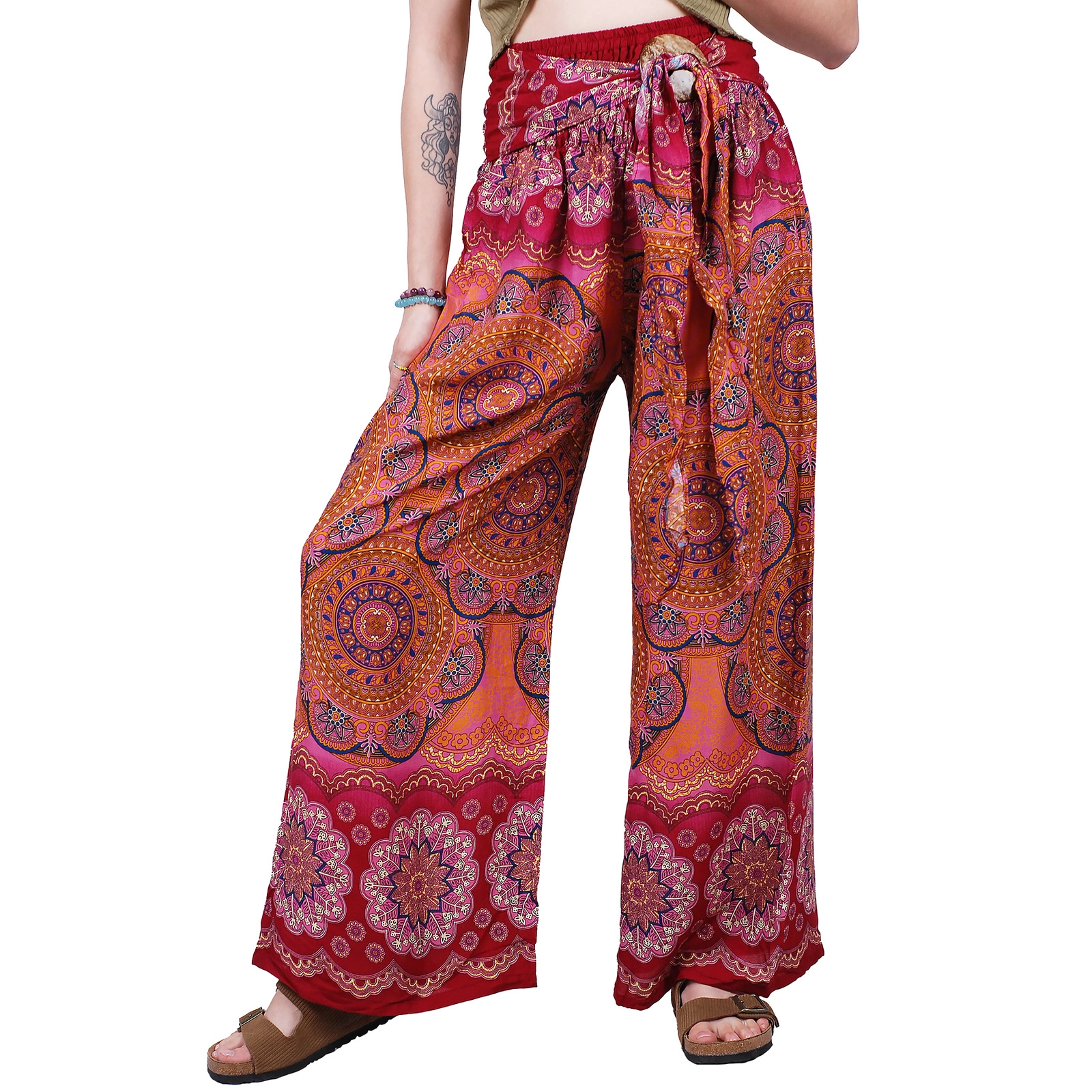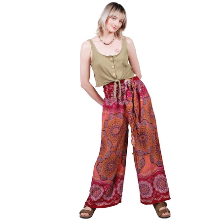 Wykonane z delikatnej wiskozy spodnie wzorzyste wiązane kolorowe łączą funkcjonalność z wyrazistym stylem inspirowanym kulturą Azji.