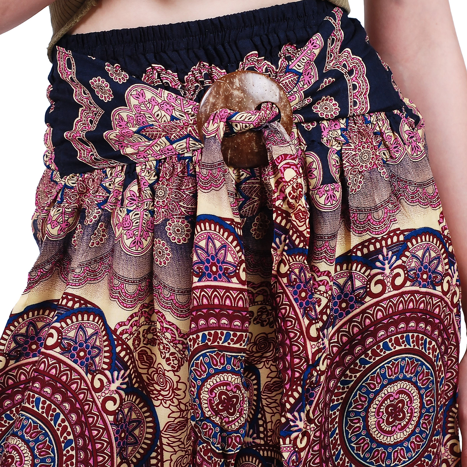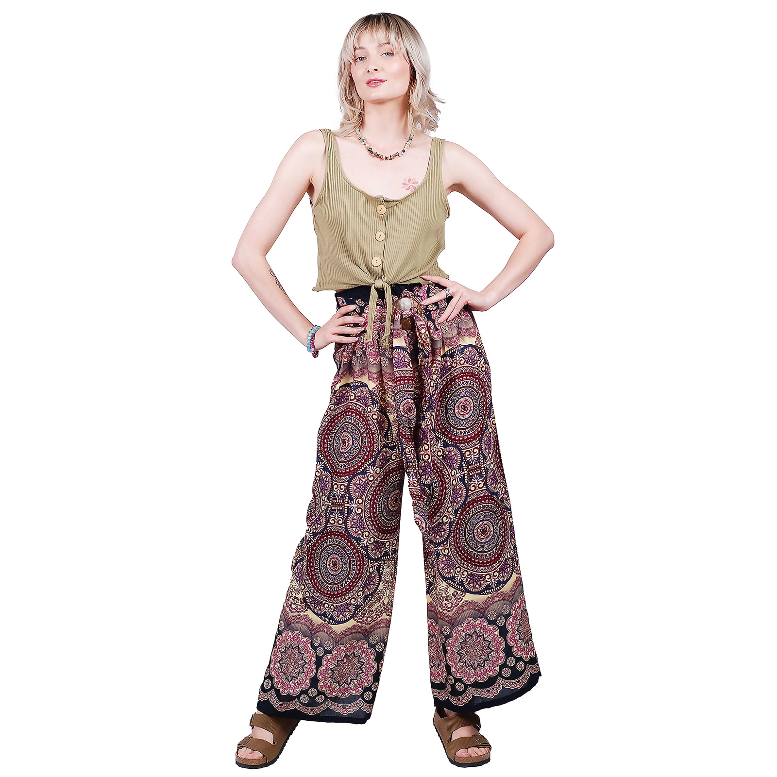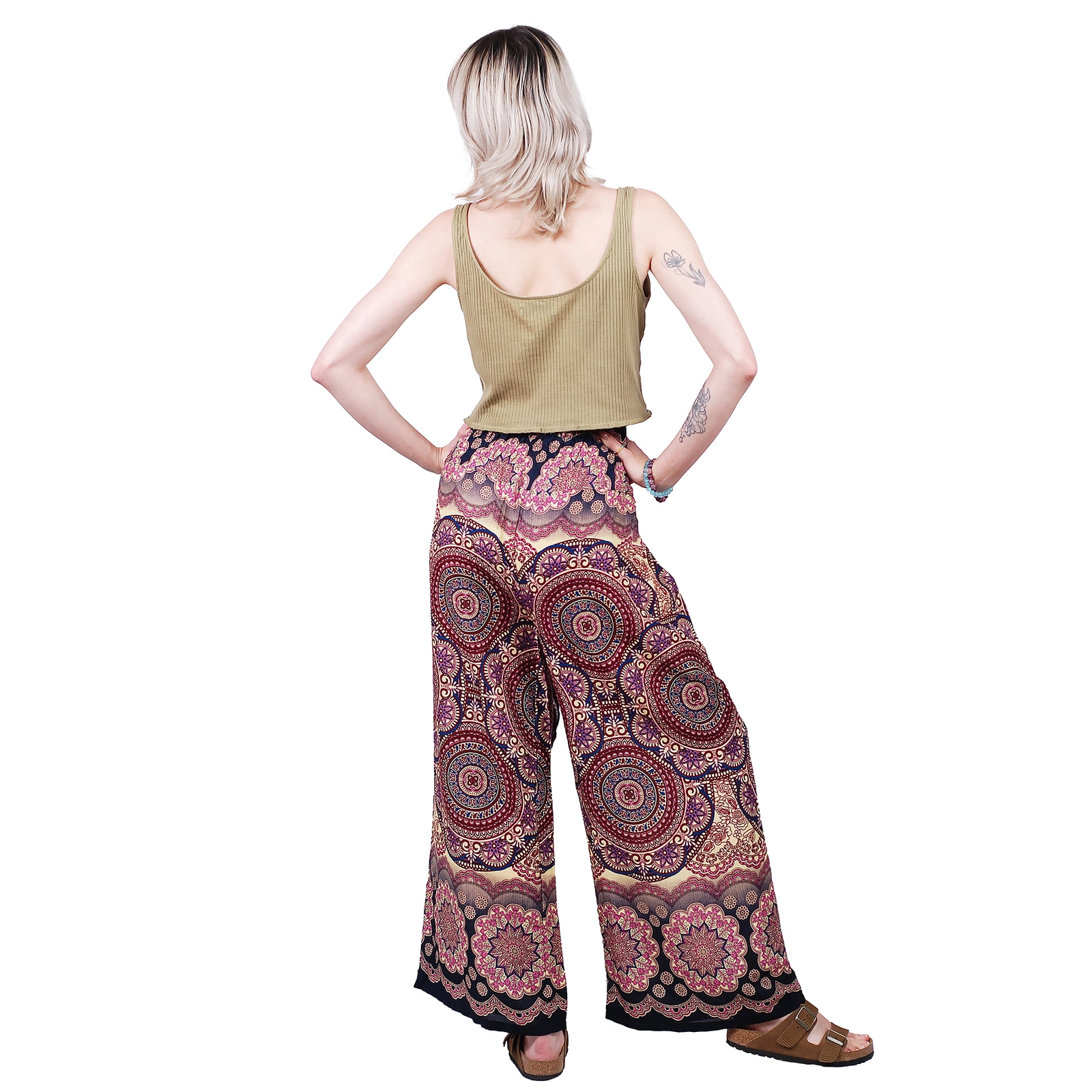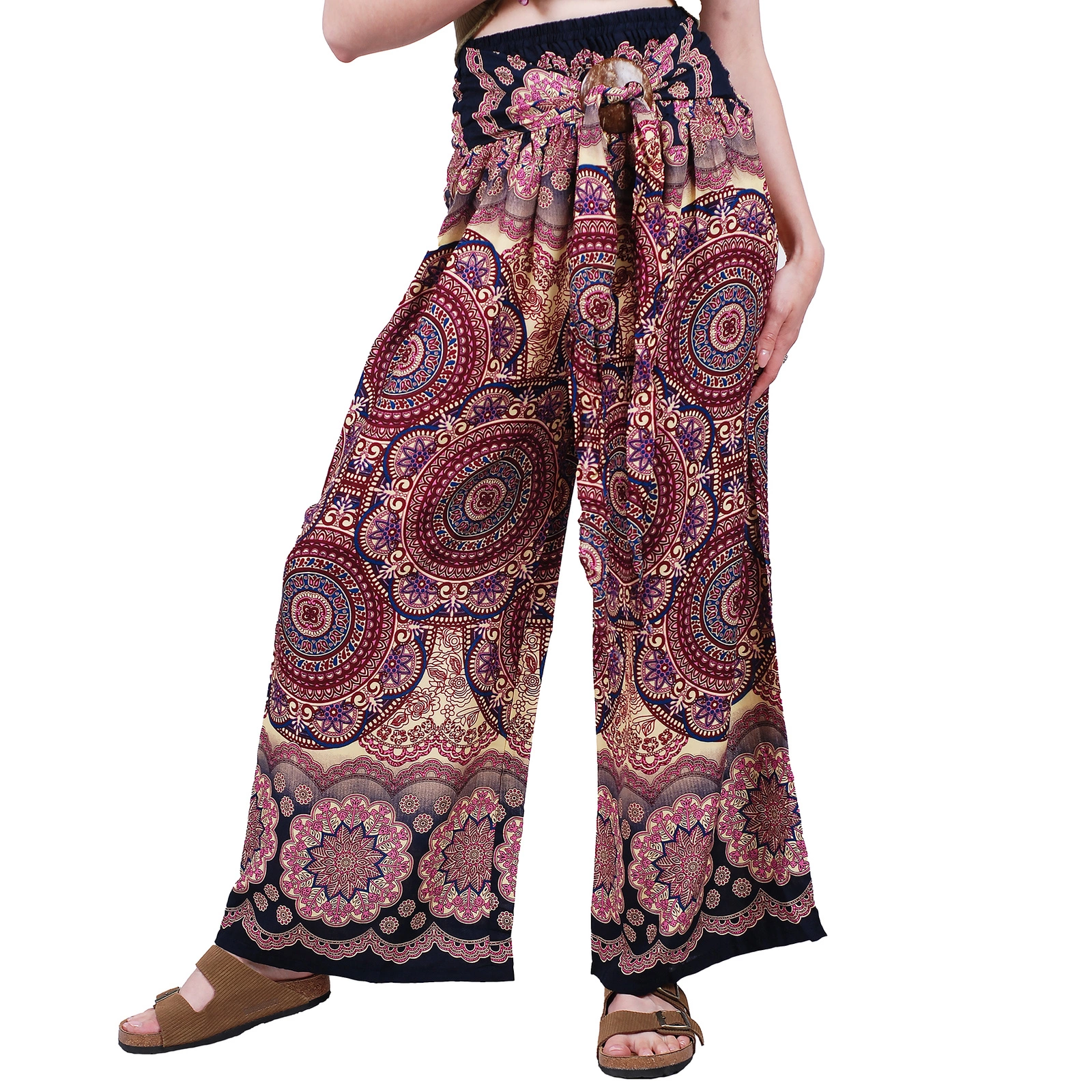 Wykonane z delikatnej wiskozy spodnie wzorzyste wiązane kolorowe łączą funkcjonalność z wyrazistym stylem inspirowanym kulturą Azji.