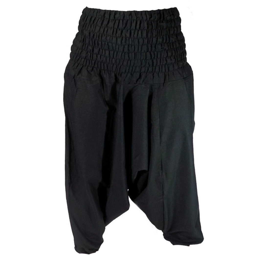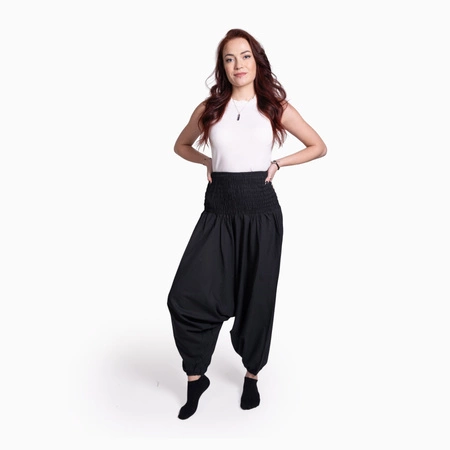 Wykonane z naturalnej bawełny szarawary czarne łączą wygodę z prostym, uniwersalnym stylem.