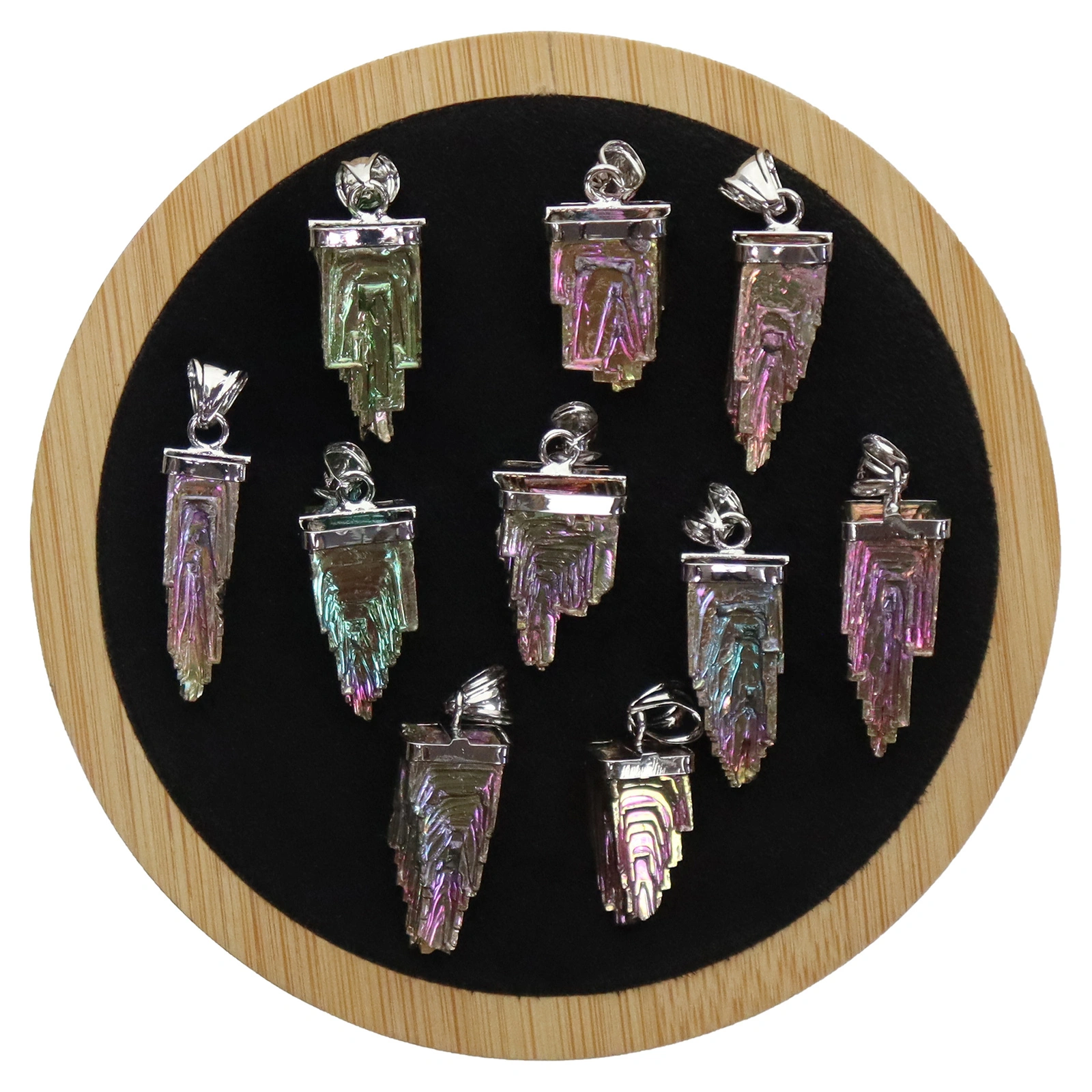 Niepowtarzalny wisiorek z bizmutu łączy w sobie naturalny proces krystalizacji z nowoczesną, dekoracyjną formą.