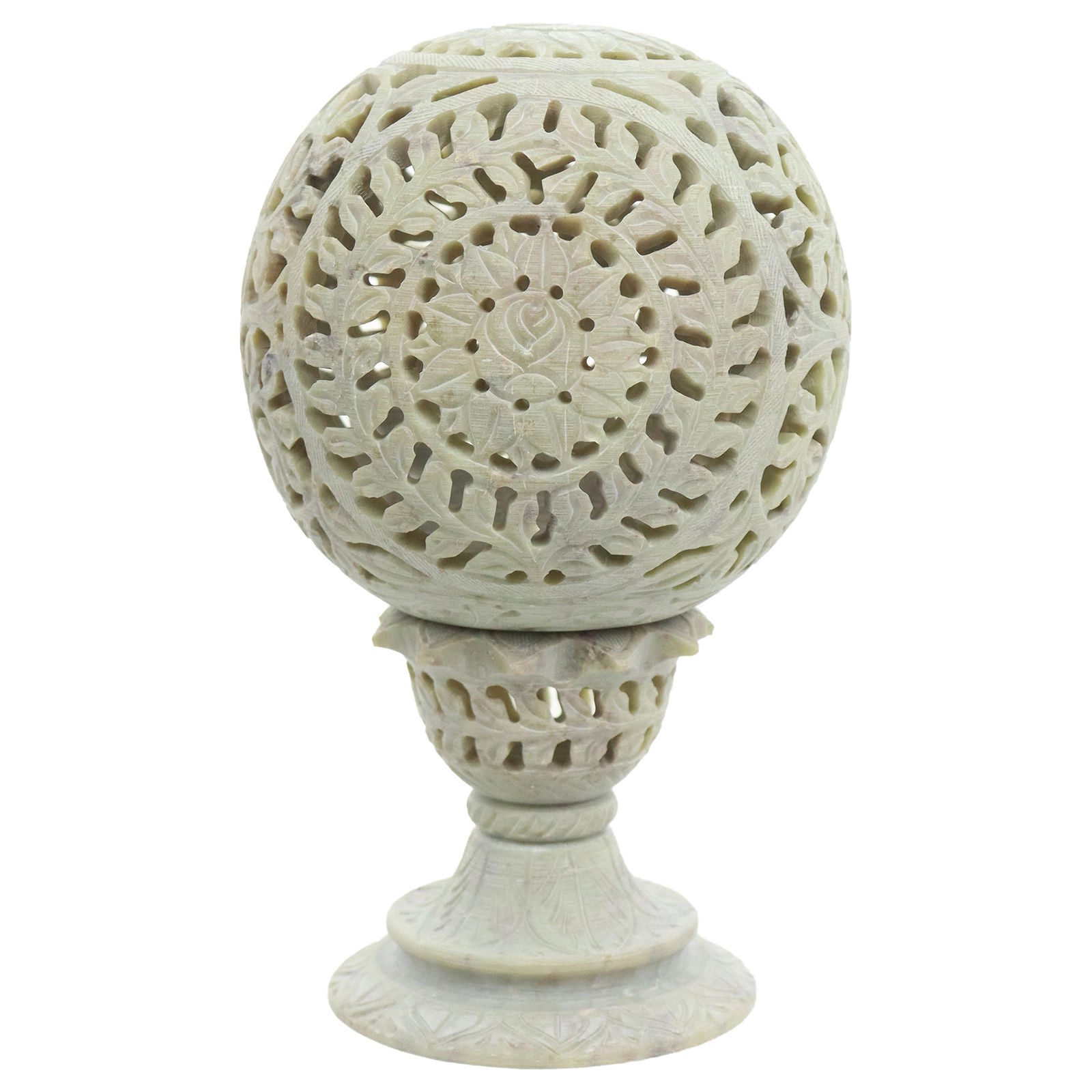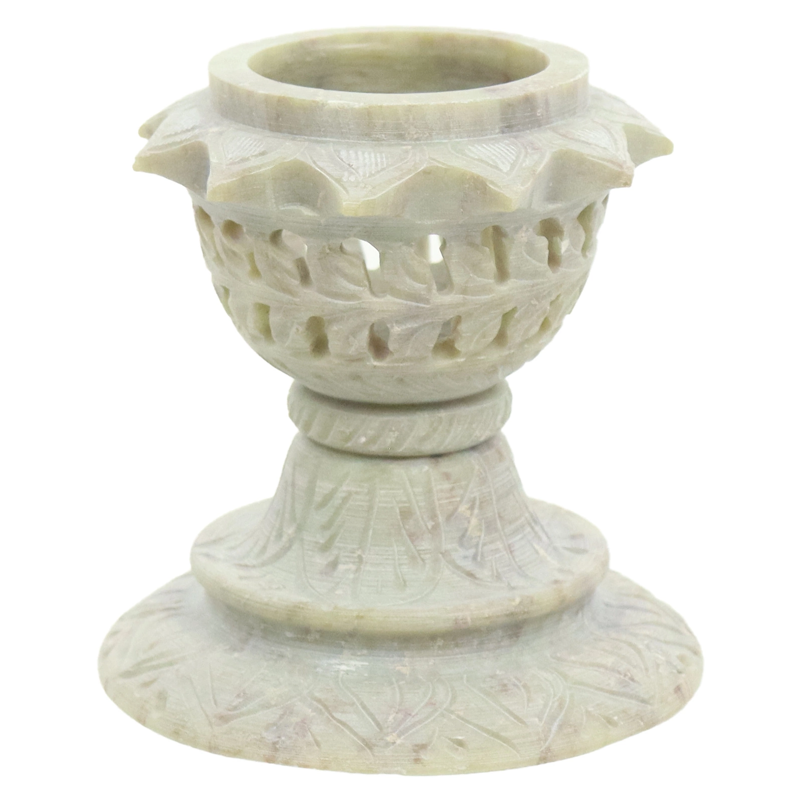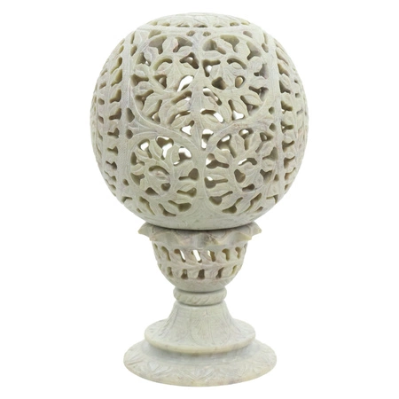 Ten wysoki świecznik z kamienia mydlanego, ręcznie wykonany w Indiach, to dzieło sztuki kamieniarskiej z miasta Agra – słynącego od wieków z mistrzowskiej obróbki marmuru i steatytu (kamienia mydlanego). Ażurowa kula z misternymi zdobieniami osadzona jest na dekoracyjnej podstawie, dzięki czemu świecznik doskonale sprawdzi się jako elegancka ozdoba wnętrza – na półce, komodzie czy biurku. To unikatowa rzeźba kamienna, wykonana w tradycyjnej manufakturze, która wniesie do Twojego domu orientalny akcent i poczucie wyjątkowości. Naturalny steatyt oraz staranne, ręczne wykończenie sprawiają, że każda sztuka jest jedyna w swoim rodzaju i zachwyca detalem. Każdy wysoki świecznik z kamienia mydlanego jest niepowtarzalny i może nieznacznie różnić się kolorem oraz wzorem, co czyni go jeszcze bardziej wyjątkowym.